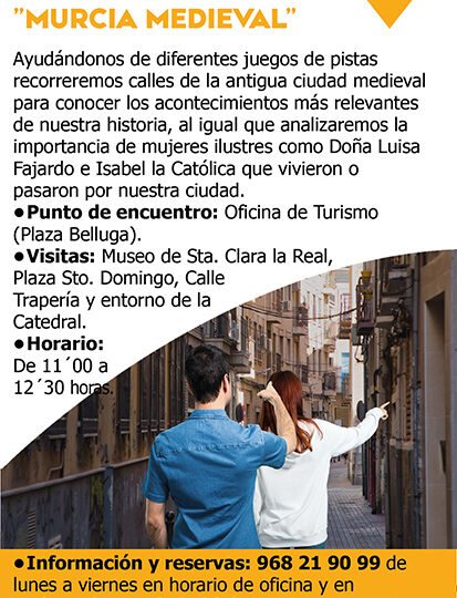 Tras hacer una parada durante el verano, las rutas regresan este otoño, a partir del 27 de septiembre de 2025, con la Gymkhana cultural “Murcia Medieval”. En esta propuesta, los participantes se apoyarán de diferentes juegos de pistas para recorrer calles de la antigua ciudad medieval y conocer así los acontecimientos más relevantes de la historia de Murcia, al igual que analizarán la importancia de mujeres ilustres como Doña Luisa Fajardo e Isabel la Católica. Ya se puede realizar la reserva de plaza par participar en esta ruta.